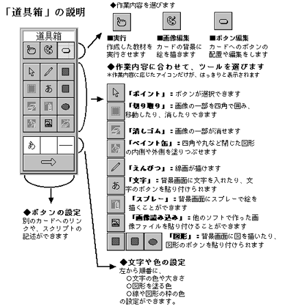 小学生が利用することを想定して,マウス操作を主体としたオーサリングソフトの開発は,KiT95が,日常的に使われるようになるために不可欠の要因であった。KiT95オーサリングソフトは,リンク設定をマウス操作で行うことができるなど,先に開発したKiTエディタの機能を継承している。しかし,ツールバーやツールボックスを利用して,お絵かき感覚で描画することを可能としたことに大きな特長がある【図4-1-3】【図4-1-4】。