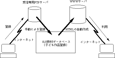サーバには,(1)作品の登録の管理 (2)データベースへの作品の登録 (3)作品紹介のHTML化 (4)KiTプレーヤーやオーサリングソフトの配布などのサービスがある。これらを管理するために,次のようなシステムを構築した【図4-1-8】。
