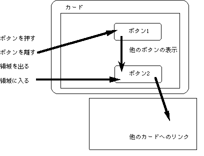 画面を切り替えるための視覚効果としては,新しい画面がせり上がったり,市松模様で画面が変化するものを追加した。KiTでは,マウスを押すというイベントに対してのみ動作を記述できたが,KiT95では,「マウスのボタンを押す」「マウスのボタンを離す」「ボタン領域から出る」「ボタン領域に入る」という4つのイベントに対応する動作ができるようにした。この4つのイベントに対して画面のボタンが動作し,他のボタンを表示したり,他のカードにリンクしたりする。これらの動作は,これまでのKiTを継承しており,HyperCardとほぼ同様である【図4-1-1】。