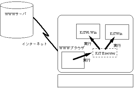 そこで,アプリケーションに変更を加えずに,複数のファイルをアプリケーションに渡したい場合,複数ファイルを1つにまとめて転送し,それを展開し,アプリケーションに渡す仲介プログラムが必要になる。これが,今回開発したKITWEXEである。すなわち,KITWEXEはWWWブラウザからLHAで圧縮された1つのファイルを受け取り,それを展開し,制御をKiTプレーヤーというアプリケーションに渡すことにより,KiTの実行を可能にする【図4-1-6】。なお,作品や教材は,あらかじめ圧縮して,1つのファイルとしてWWWサーバー上のデータベースへ,拡張子"LZK"としてあらかじめ登録しておく。