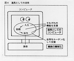 1970年代の後半のマイクロコンピュ−タの出現は、これまでの自動処理機械、計算機といったコンピュ−タのイメ−ジを一変させた。それまでは、コンピュ−タには専用の部屋とオペレータが必要であったが、マイコンは、机上に置くことができるようになった。ハ−ドウェアの小型化とコストの激減が、コンピュ−タを個人で所有できるパ−ソナルなものに変えた。その結果、自動機械としてではなく、個人的に抱えているいろいろな情報処理(例えば、情報の収集、意思決定のためのデ−タ分析、印刷のための編集・出力など)の支援を行うための道具であるという考え方が出てきたのである。