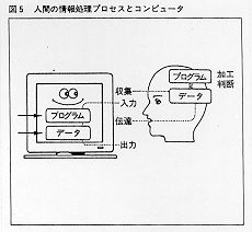 プログラム領域は、データ領域と演算レジスタの間のデータのやりとり、計算、判定と制御をそれぞれ行えるような一つ一つの簡単な機械語の命令として記憶されており、プログラムカウンタの示す番地に従って、順次自動的に処理が実行されていく。ただし、一つ一つの命令を実行する速さは、現在のコンピュータでは、10-6 〜10-8 秒程度であるために、コンピュータは大量の情報処理を高速にこなすようにみえる。このようにコンピュータは、人間の情報処理プロセスをモデルにして開発されてきた。たとえば、人間も、外界から数多くの情報を受け取って、行動や発言として外界へ出力を出すものと考えるならば、さしずめデータ領域は、脳の記憶になり、プログラムは、トレーニングや生活の知恵によってついてきた技能や判断力ということになる。
