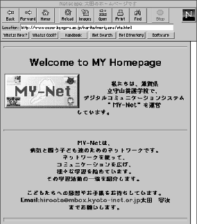 | (6)アカウント | インターネットに関しては生徒のアカウントはないが,教師個人でインターネットのプロバイダに加入し,ダイアルアップでインターネットに接続し,ホームページ「病気と闘う子ども達のためのネットワーク」も公開している。 |