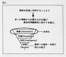 二つ目は、私達がコンピュ−タに情報を大量に詰め込むことができたとしても、その情報を一つ一つ読み出す時間はないという事実である。例えば、先輩や親からこれまで学習してきたノ−トを百科事典のように1Gbyteコピ−して、プレゼントされたとしても、読み始めれば、それだけで一生かかってしまうのである。すなわち、情報は、すでに生身の人間では処理しきれないほど大量であり、もっているだけでは何の価値もない。これを的確に処理し、有効な情報に加工するには、情報処理の機械をうまく使いこなす「知恵」が必要になる。